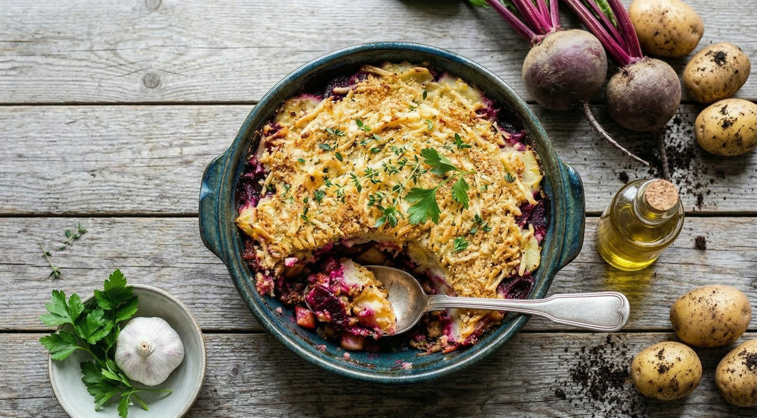 Recept: vegan ovenschotel met rode biet en aardappel uit eigen tuin